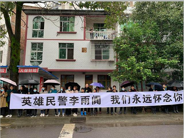 载着李雨阗灵柩的灵车在警车护卫下,沿着北门大道、人民中路、兴贤街、滨江路、东城派出所等路段缓缓前行。在英雄牺牲的梨乡故土,李雨阗的生前战友拉着“忠诚践誓言、浩气贯长虹”“战友李雨阗,一路走好”等横幅,泣不成声送别亲爱的战友最后一程。