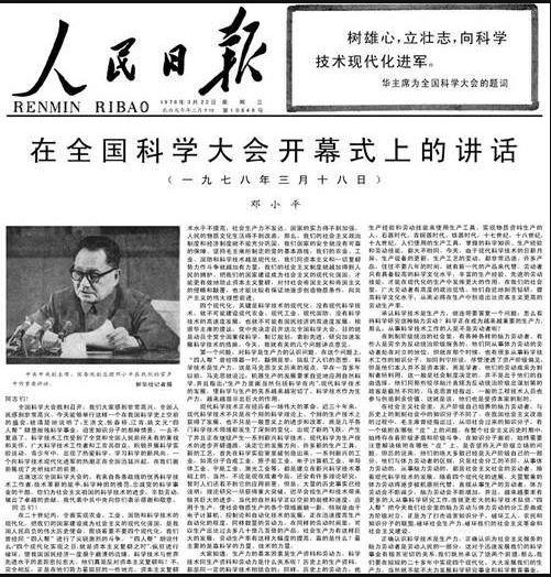 1978年3月邓小平主持召开的全国科学大会,被视为中国科技的春天。邓小平发表重要讲话,指出四个现代化的关键是科学技术的现代化。
