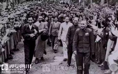 1951年4月,邓小平和各界群众欢迎以阿沛·阿旺晋美(前左一)为首的西藏地方政府代表团途经四川前往北京。