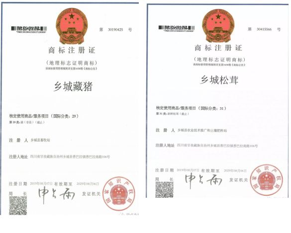 近日,乡城藏猪(活体、非活体)、乡城松茸(鲜品、干片)获得国家知识产权局颁发的《地理标志证明商标》证书。