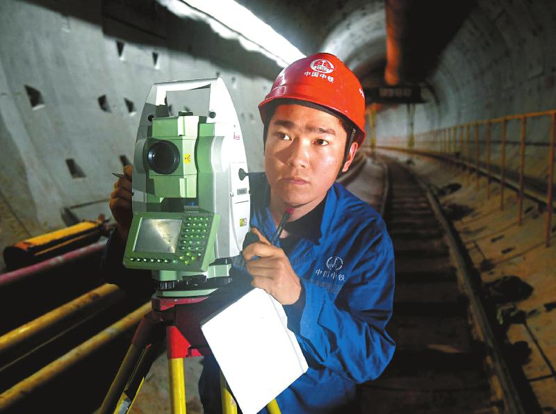 地铁测量 中铁二局城通公司成都地铁8号线盾构项目部工作人员在莲花站-文星站区间左右线盾构隧道进行测量。