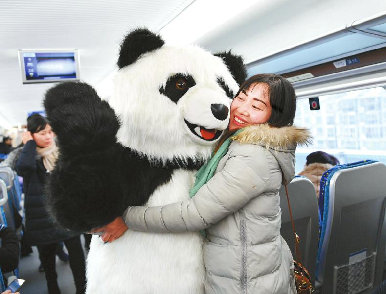大熊猫人偶助阵,市民争相与其合影。本报记者 肖雨杨 摄