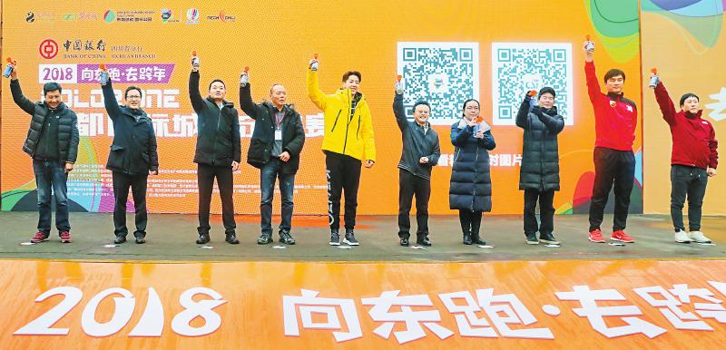 2018年12月31日,成都东郊记忆音乐公园,数千名运动爱好者和音乐发烧友汇聚在这里,点燃了现场的激情与活力,使节日里的成都成为一片欢乐的海洋。他们和知名歌手王铮亮、女排世界冠军张晓雅一起,共同拉开了中国银行2018“向东跑·去跨年”Color One成都国际城市定向赛&Mech Chili辣浪电子音乐节开幕式的帷幕。□胡严(图片由成都体育产业有限责任公司提供)