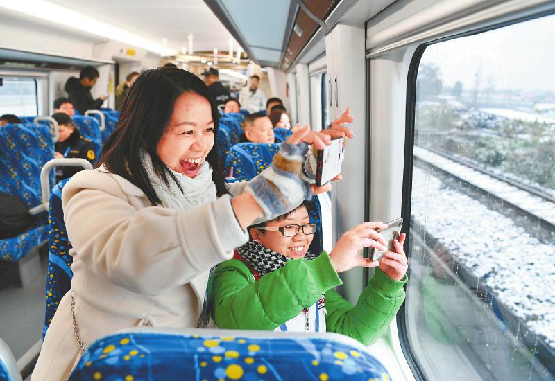 “天府号”即将出发,乘客在车头前合影。 本报记者 肖雨杨 摄