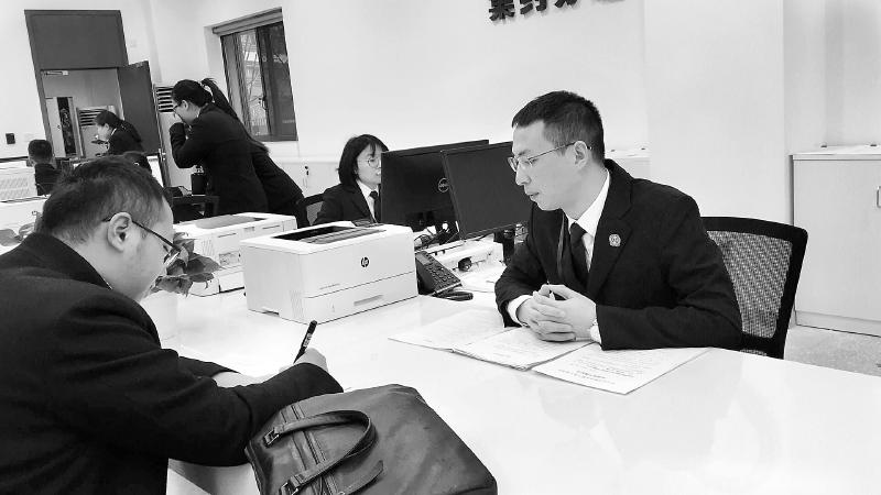 ②四川英冠律师事务所律师王静超(左一)在诉讼服务大厅领取受案通知书。
