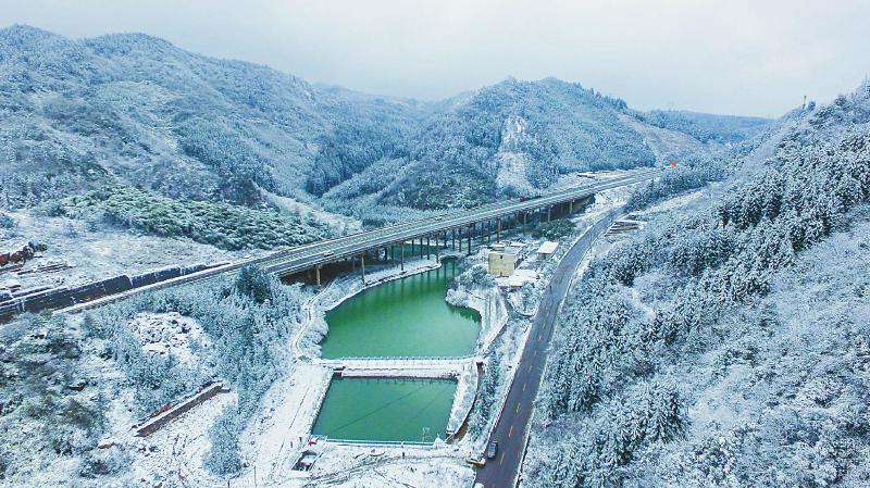 1月2日,航拍泸州市叙永县境内G76厦蓉高速,车辆行驶在南国雪乡中,铺满白雪的山峦显得壮美磅礴。 李欣 摄(视觉四川)