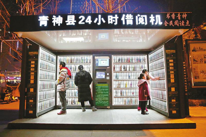 2018年12月31日,读者在位于眉山市青神县中岩广场的24小时图书借阅机前借阅图书。 张忠苹 摄(视觉四川)