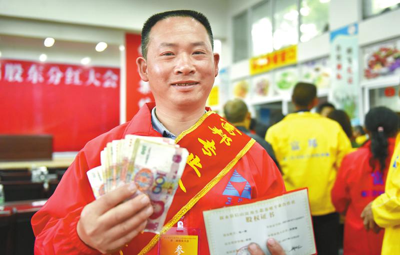 三斗米村贫困户股民肖亿银展示自己的股权证书和分得的红利。苏忠国 摄