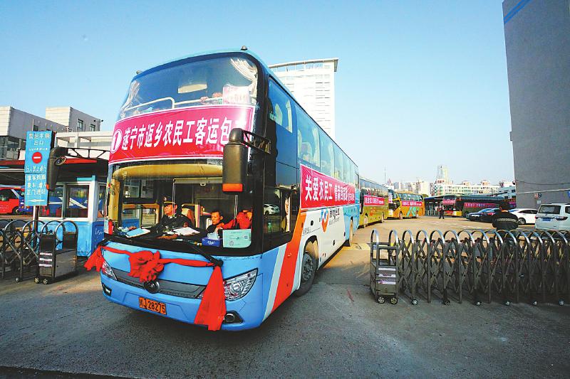 1月26日,5辆返乡直达包车从广东佛山出发。 樊任华 摄