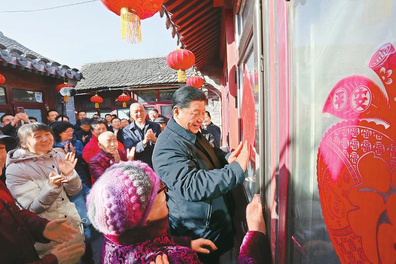 2月1日上午,习近平在前门东区草厂四条胡同32号院,高兴地拿起一幅“福”字,亲自贴到门上,给这里的老街坊们拜年。 新华社记者鞠鹏摄