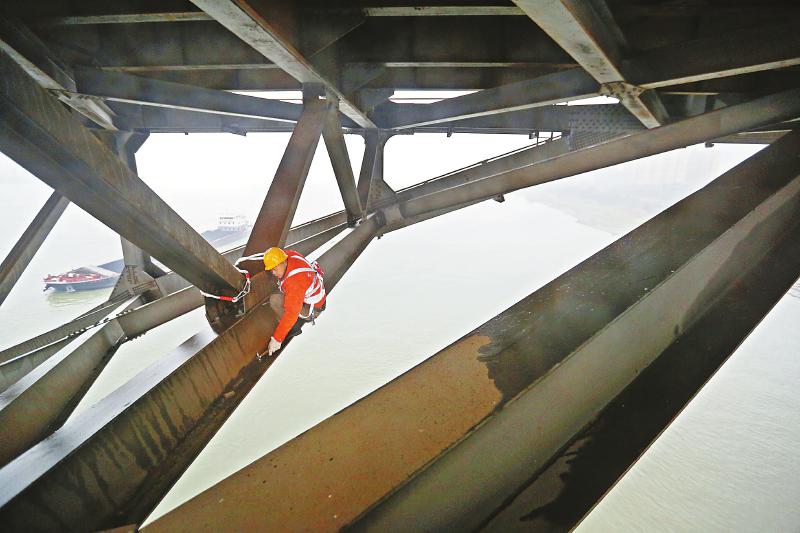 1月31日,桥梁工在九江长江大桥上进行检修作业。