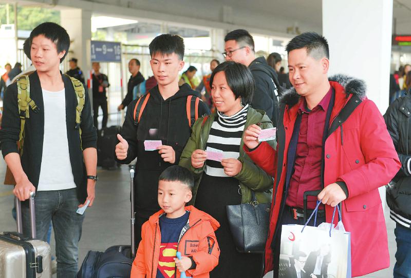 1月27日09:40 李小军一家准备登上从广州火车站出发的专列,与1200余名川籍在粤务工人员一同回家。