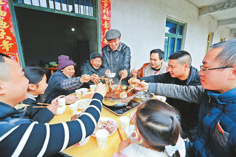 中江县东北镇立本村村民吕世斗一家吃火锅团年。