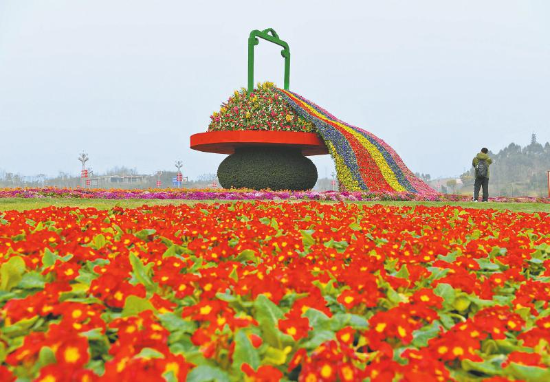 成都科学城、兴隆湖片区等区域布置了数万盆三色堇、报春花、金盏菊等花卉,营造出一片喜庆祥和的节日氛围。在兴隆湖畔,一个高达10米的“大花篮”夺人眼球。 本报记者 肖雨杨 摄