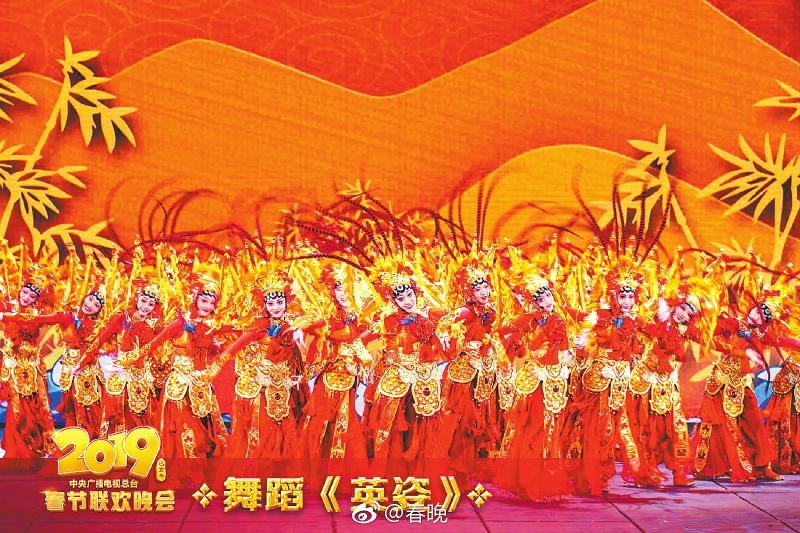 今年央视春晚表演现场的“四川元素”格外亮眼,除川航“英雄机组”亮相,川籍歌手张杰、郁可唯、吉克隽逸献唱外,超过170人的“舞蹈大军”参与了包括压轴舞蹈《英姿》在内的约10个舞蹈节目,约占节目总数量的四分之一。图为压轴舞蹈《英姿》。 据央视春晚官方微博