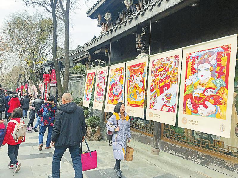在四川过春节,好看好玩又好吃。来自各地的精美年画吊旗成了成都宽窄巷子的一道风景线。本报记者 杨艺茂 文/图