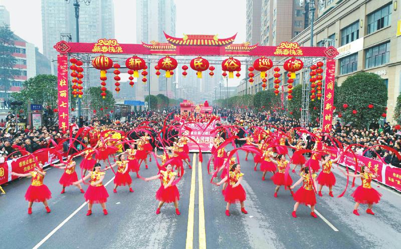 2月5日,南充市蓬安县城,千余人的民间民俗队伍沿街巡演舞龙、舞狮、旱船、薅秧歌、采莲船、花扇舞、彩绸舞等传统民俗节目。 刘永红 摄(视觉四川)