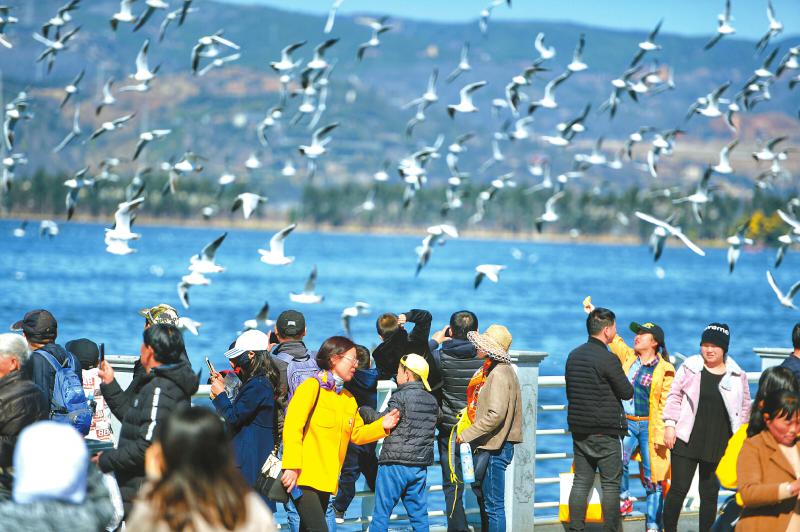 2月5日,市民和游客在昆明滇池与红嘴鸥嬉戏。当日是大年初一,不少昆明市民与外地游客来到滇池大堤,与来此越冬的红嘴鸥近距离接触,欢度佳节。新华社记者 秦晴 摄