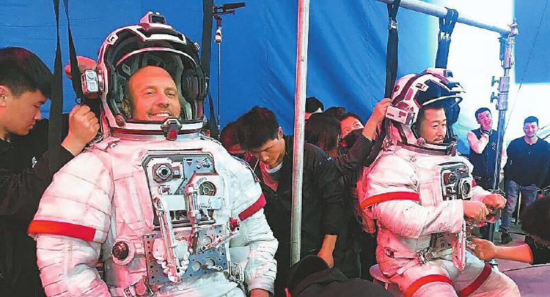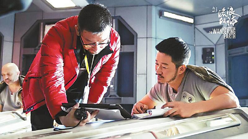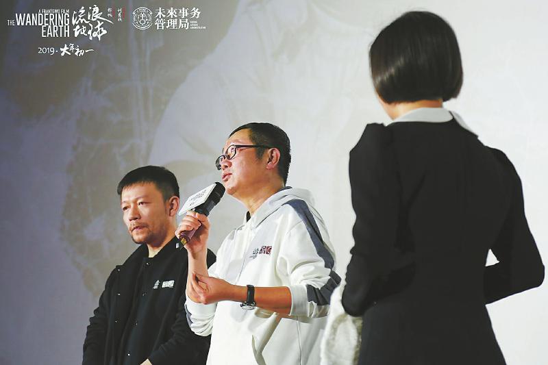 刘慈欣(右)在此前举行的《流浪地球》观影会上。巽摄