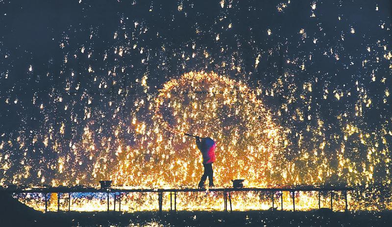 2月5日晚,民间艺人在河北遵化市亚太庙会上表演“打树花”。春节期间,河北遵化市亚太庙会举办“打树花”实景民俗表演。新华社发(刘满仓 摄)