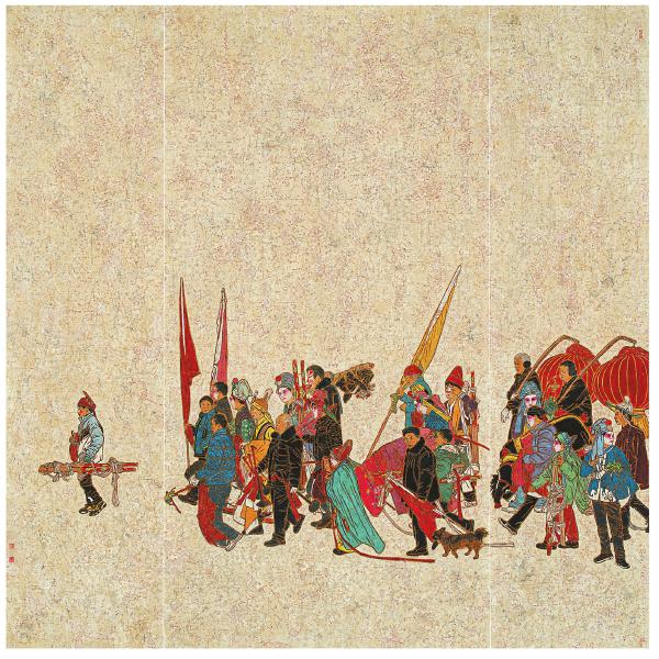 农历正月,不少地方都有看戏的习俗,民间戏班也因此总是奔波在途中。范士轩的这幅《正月风·晨曲》,便巧妙地选取了这一场景加以表现。戏班众人从画面右下方走出,以箭头般的队形向左行进,形成一种不疾不徐的韵律感。画面背景并没有表现具体的场景,呈现出一种典雅的色调与质感,这一方面凸显出传统戏曲艺术的厚重感,另一方面让戏班每个人的行当、分工和情态都清晰可见。作者借鉴了年画等民间美术技法,彰显喜庆气氛的同时,又给人带来新年的新气象。 (余如波)