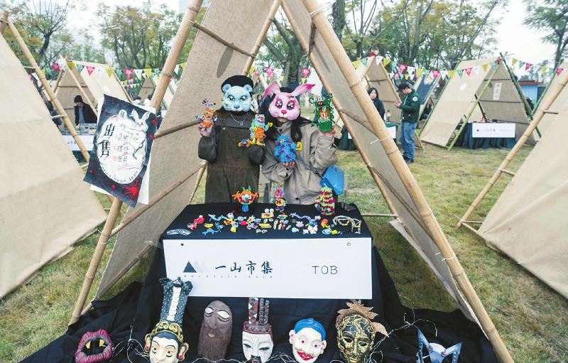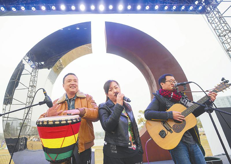 音乐人何非(左)和他的伙伴用音乐为成都人带来节日快乐。
