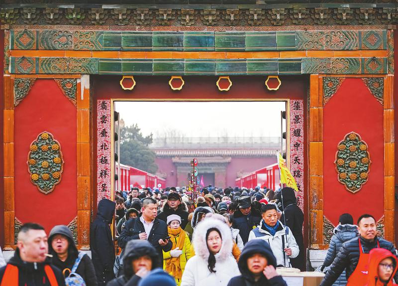 北京 2月5日,人们在故宫举行的“中华老字号故宫过大年展”上游玩。当日是农历大年初一,众多市民和游客来到北京故宫参观游览,感受年味,欢度春节。 新华社记者 沈伯韩 摄