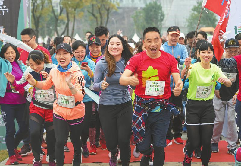 成都市民参加“绿道plogging跑”。plogging已然成为跑圈最酷的新型运动,鼓励人们在慢跑中弓步、蹲起或是在停止后拾起身边的垃圾,在保持自我健康的同时改善城市的健康。