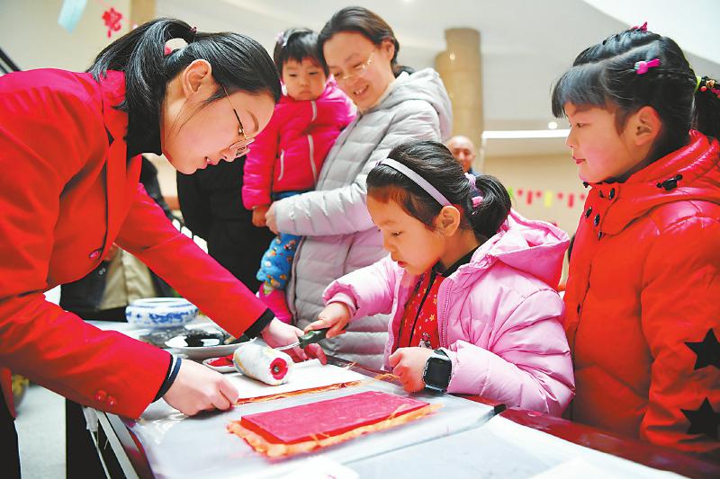 郑州 2月6日,小朋友在郑州博物馆体验制作木版年画。 新华社记者 李嘉南 摄