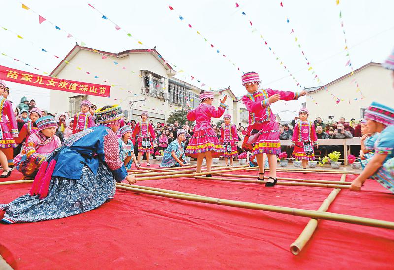 2月9日,泸州市纳溪区打古镇古纯村的苗族男女身着民族服装,孩子们跳起了竹竿舞,喜庆苗家传统节日“踩山节”。 本报记者 何海洋 摄