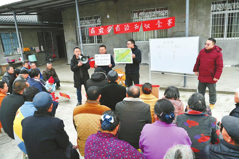 2月24日上午,德阳市旌阳区黄许镇富新村一农家小院里,一场别开生面的小春作物“病虫害防治知识竞赛”在这里举行,50余名种植户参加竞赛。连日来,旌阳区100余名农技人员深入11个乡镇,进村入户开展田管、春耕技术培训。 本报记者肖雨杨摄