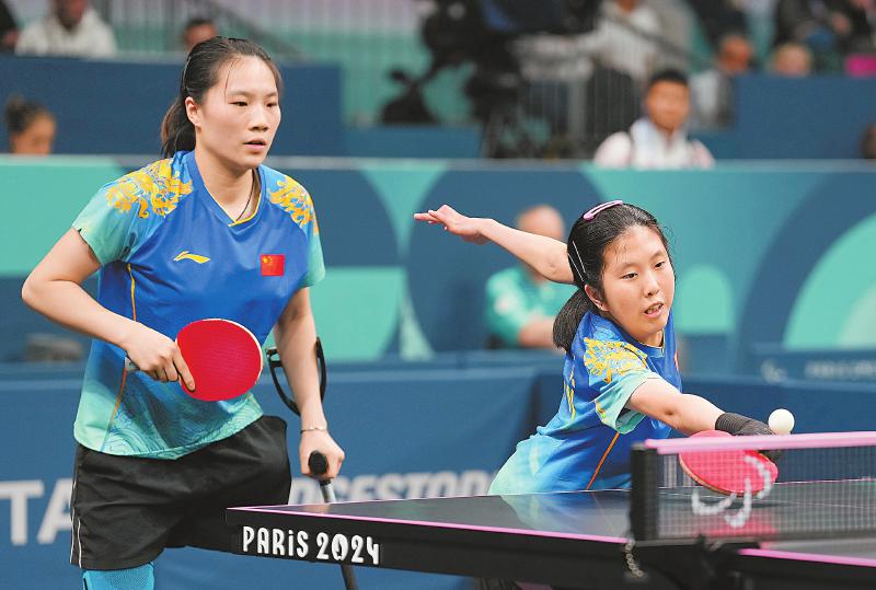 当地时间八月三十日,在巴黎奥运会乒乓球女双十四级决赛中,中国组合黄文娟/金芋成三比一战胜德国组合斯特凡妮·格雷贝/尤利亚妮·沃尔夫,获得冠军。图为中国组合黄文娟/金芋成(右)在比赛中。新华社记者侯昭康摄