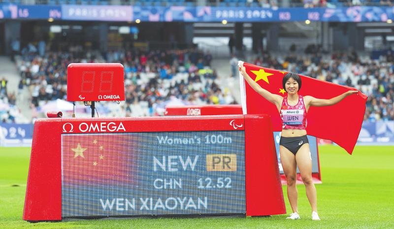 当地时间9月5日,在巴黎残奥会田径女子100米T37级决赛中,中国选手文晓燕以12秒52的成绩夺得冠军,并创造新的残奥会纪录。 新华社记者 才扬 摄