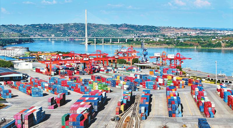 9月4日,泸州港国际集装箱码头,货轮在泊位上有序装卸。近年来,作为四川第一大港的泸州港加快建设智慧绿色港口,开行“川渝沪直达快线”,开通重庆、泸州、宜宾“水水中转”穿梭巴士,推动区域协同联合发展,积极融入成渝地区双城经济圈建设。已建成6个3000吨级兼顾5000吨级直立框架式泊位。今年1—6月,泸州港集装箱吞吐量达10.78万标箱,同比增长9.19%。 刘学懿 摄(C视觉)
