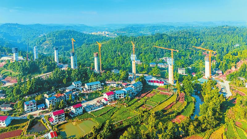 近日,资阳市安岳县横庙乡,中铁五局施工人员正在进行成渝中线高铁安岳段高桥建设,现场一派热火朝天的忙碌景象。成渝中线高铁作为我国“八纵八横”高铁网沿江通道的重要组成部分,是连接成渝两地发展的“经济大动脉”,项目正线长度291.315公里,设计时速350公里,预计2027年底建成通车。 杨康忠 摄(C视觉)