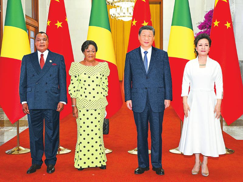 9月6日上午,国家主席习近平在北京人民大会堂同来华出席中非合作论坛北京峰会并进行国事访问的刚果(布)总统萨苏举行会谈。会谈前,习近平和夫人彭丽媛在人民大会堂北大厅为萨苏和夫人安托瓦内特举行欢迎仪式。这是习近平和彭丽媛同萨苏和安托瓦内特合影。 新华社记者 李学仁 摄