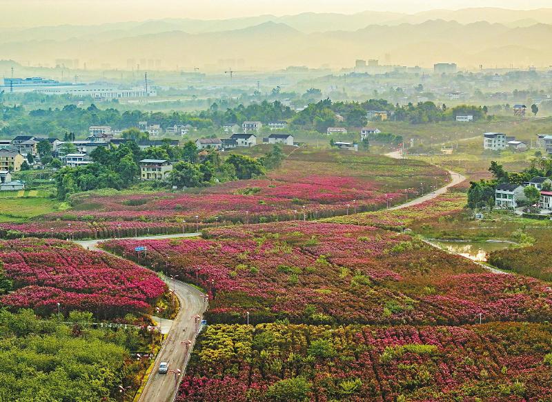 9月6日,广安华蓥市禄市镇凉水井村,花海中蜿蜒的“四好农村路”与晨雾缭绕下的村庄相互映衬。近年来,地处山区的华蓥市把交通建设作为改善民生和推进区域经济社会发展的重要支撑,逐步形成城乡贯通、区间快速、主次分明的交通网络。截至目前,该市公路总里程达1200多公里,公路密度达258.68公里/百平方公里。 邱海鹰 摄(C视觉)