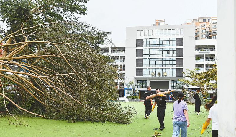 9月7日19时00分,海南省气象局解除台风四级预警。图为当天海口市滨海第九小学,工作人员在清理校园。新华社记者 杨冠宇 摄