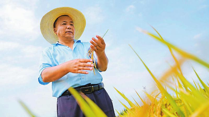 杨福明查看稻穗。四川日报全媒体记者 李志强 摄