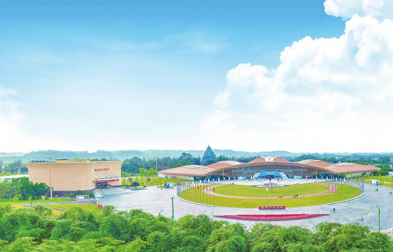 位于眉山市青神县的国际竹编艺术博览馆(左)和2023中国国际竹产业交易博览会会址。 古良驹 摄