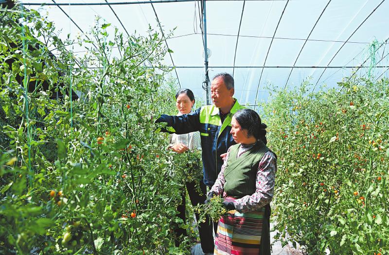 在玛吉阿米花园农庄的大棚内,山东寿光来的刘振国(中)在指导栽培技术。四川日报全媒体记者肖雨杨摄