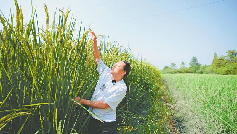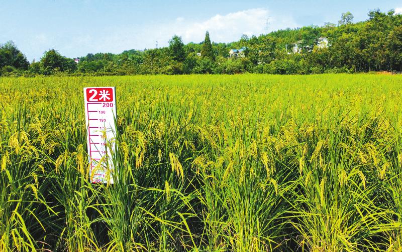 9月4日,江油市彰明镇福田村“巨型水稻6号”丰收在即。该品种水稻株高1.8米至2.2米,稻穗平均长约30厘米,产量高、品质好。 绵阳观察 郭超英 摄
