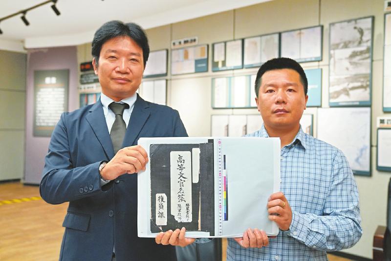九一八事变爆发93周年之际,日本学者、黑龙江外国语学院特聘教授松野诚也(左)向侵华日军第七三一部队罪证陈列馆披露一份731部队新档案,名为《陆军高等文官名簿 陆军书记官 陆军技师》。 新华社记者 王松 摄