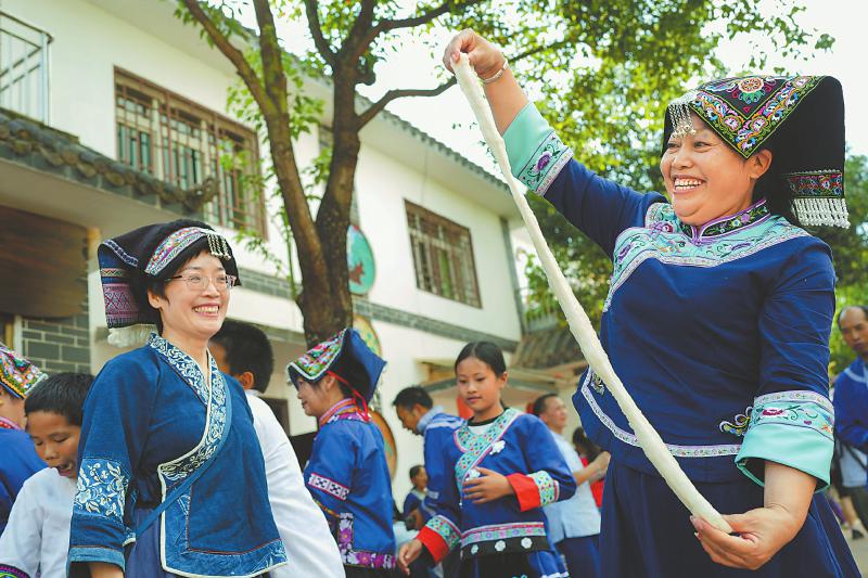 9月10日,在凉山州宁南县布依族村寨——拉落村,一位村民正展示布依族糍粑。