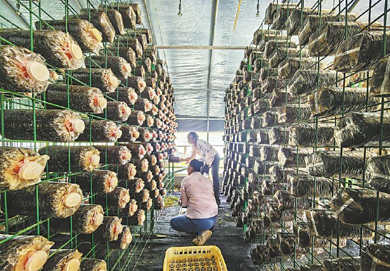 9月10日,在凉山州宁南县松新镇碧窝现代农业园区食用菌基地,村民正在放置菌包。