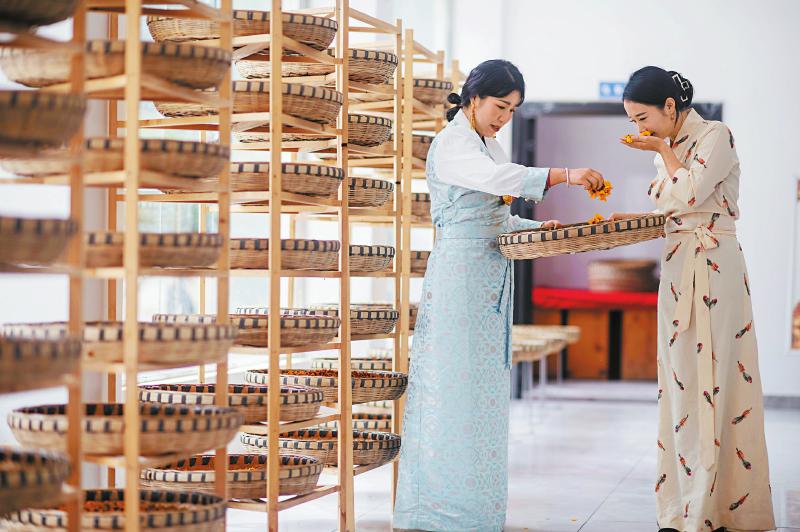 ①8月17日,阿坝州金川县二嘎里乡二嘎里村,返乡创业青年侯正琴(左)与唐辉在晾晒雪菊。通过直播带货等多种形式,高原雪菊已成为该村的特色产业。