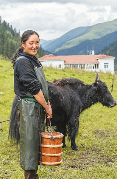 ④8月17日,阿坝州金川县毛日乡毛日村,村民蒲尔巴拉姆在牧场采集牦牛奶。采集的鲜奶会及时送至牛奶加工厂,为家里增加一笔可观的收入。