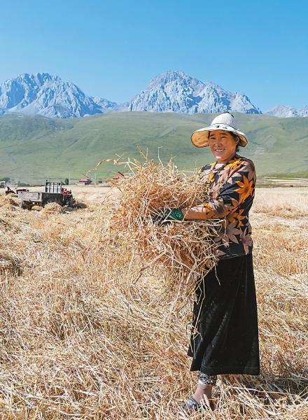 ②8月25日,甘孜州甘孜县仁果乡有机青稞基地,联合收割机完成收割后,德西青措将青稞秸秆打捆。今年她家的青稞再次增产。