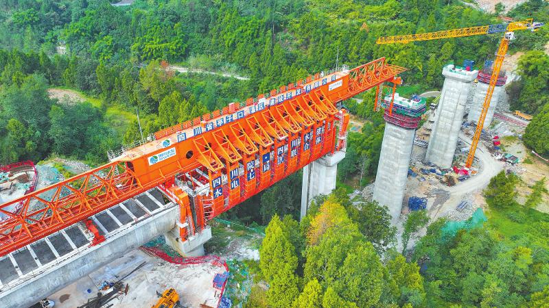 9月19日,在亭子口灌区工程阆中市石滩镇乱石窖渡槽施工现场,一台巨型造槽机屹立于两个槽墩之上,工人正在其中忙碌作业。亭子口灌区工程是国务院批准实施的172个重大水利工程项目之一,也是四川省水资源配置总体布局“五横六纵”的重要骨干工程,分两期建设。预计一期工程于2027年6月试通水。 王玉贵 摄(C视觉)