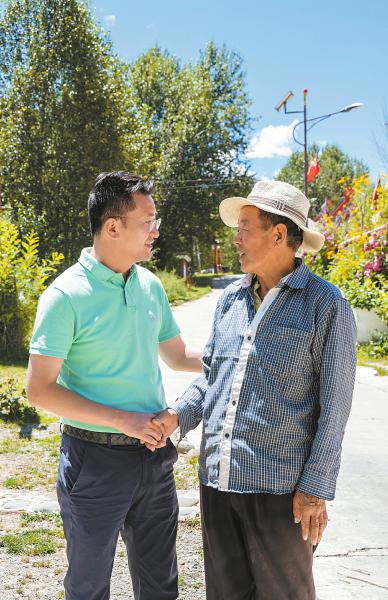 8月21日,甘孜州炉霍县雅德乡交纳村“博士名誉村长”张藜山(左)与村民拉家常。自去年担任“村长”以来,他致力于发展电商和旅游产业,成为乡村振兴的“新引擎”。